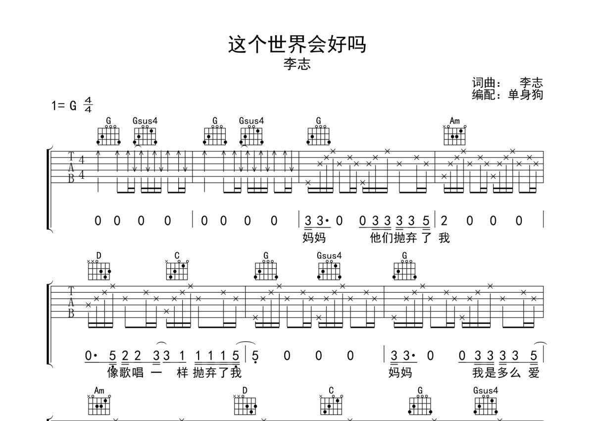 李志《这个世界会好吗》吉他谱 - G调弹唱六线谱