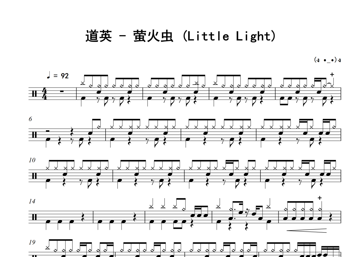 《萤火虫 (Little Light)》是道英演唱的一首歌曲,简单版,这份架子鼓谱共有两张高清图谱,图谱由 @失眠的土豆 编配上传,图谱使用五线谱编配,使用这份萤火虫 (Little Light)架子鼓谱,你将能够轻松地敲打出这首道英的萤火虫 (Little Light),快来尝试吧。