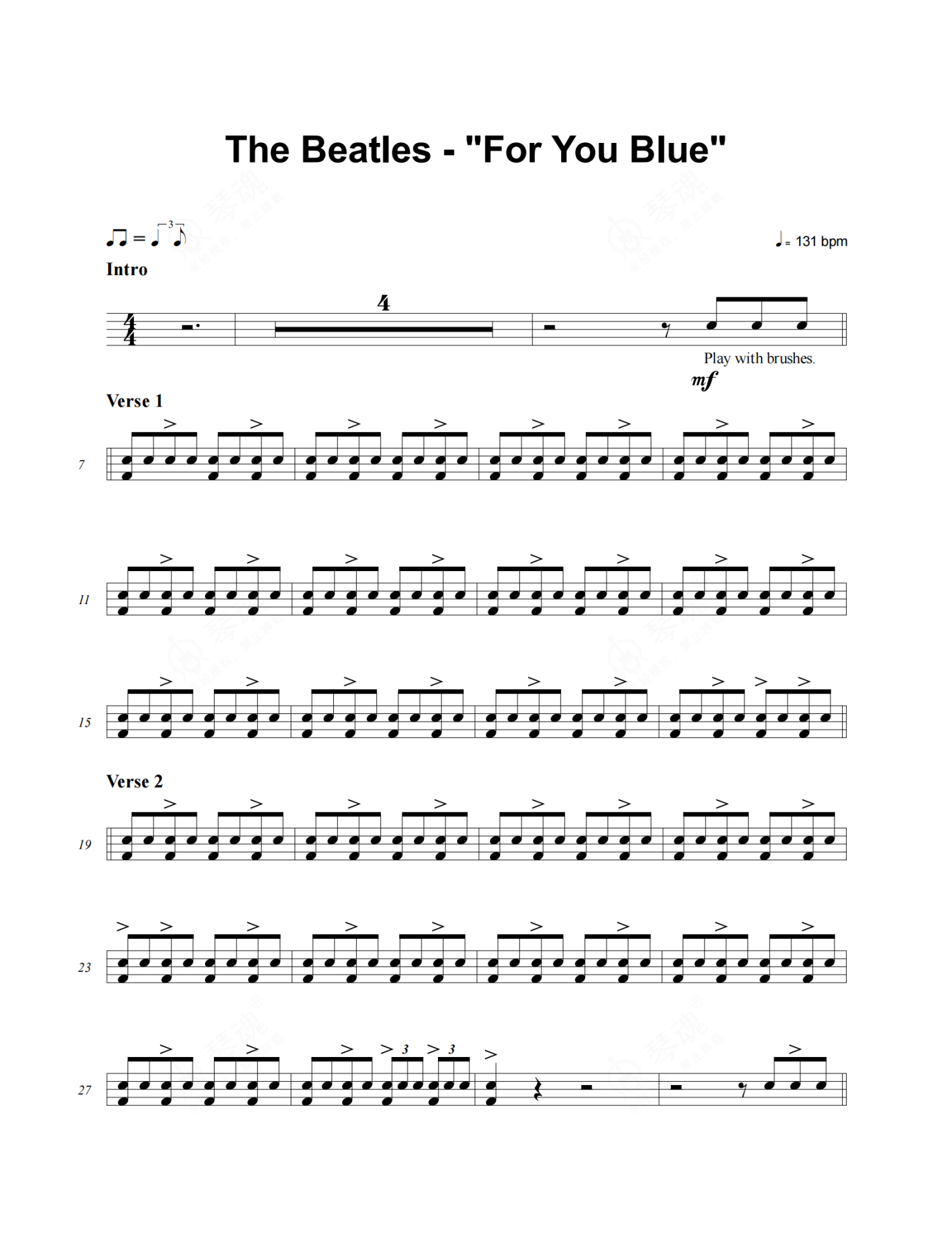 《For You Blue》是The Beatles演唱的一首歌曲,这份架子鼓谱共有三张高清图谱,图谱由 @失眠的土豆 编配上传,图谱使用五线谱编配,使用这份For You Blue架子鼓谱,你将能够轻松地敲打出这首The Beatles的For You Blue,快来尝试吧。