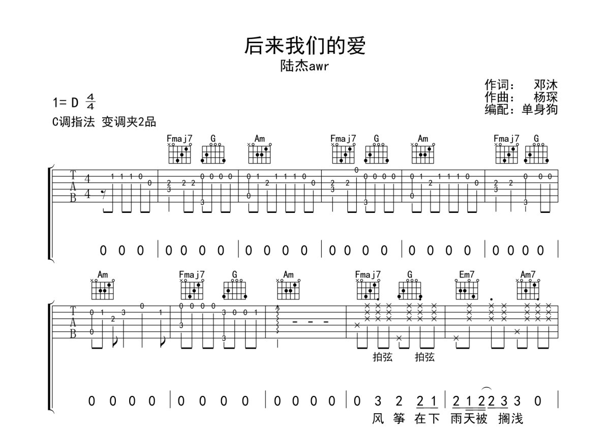 陆杰awr《后来我们的爱》吉他谱 - C调弹唱六线谱