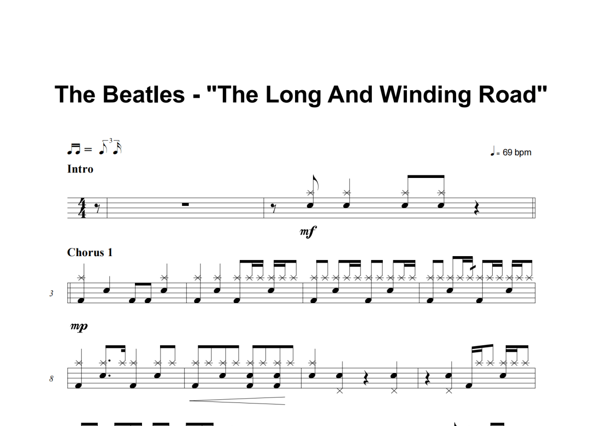 《The Long And Winding Road》是The Beatles演唱的一首歌曲,这份架子鼓谱共有三张高清图谱,图谱由 @失眠的土豆 编配上传,图谱使用五线谱编配,使用这份The Long And Winding Road架子鼓谱,你将能够轻松地敲打出这首The Beatles的The Long And Winding Road,快来尝试吧。
