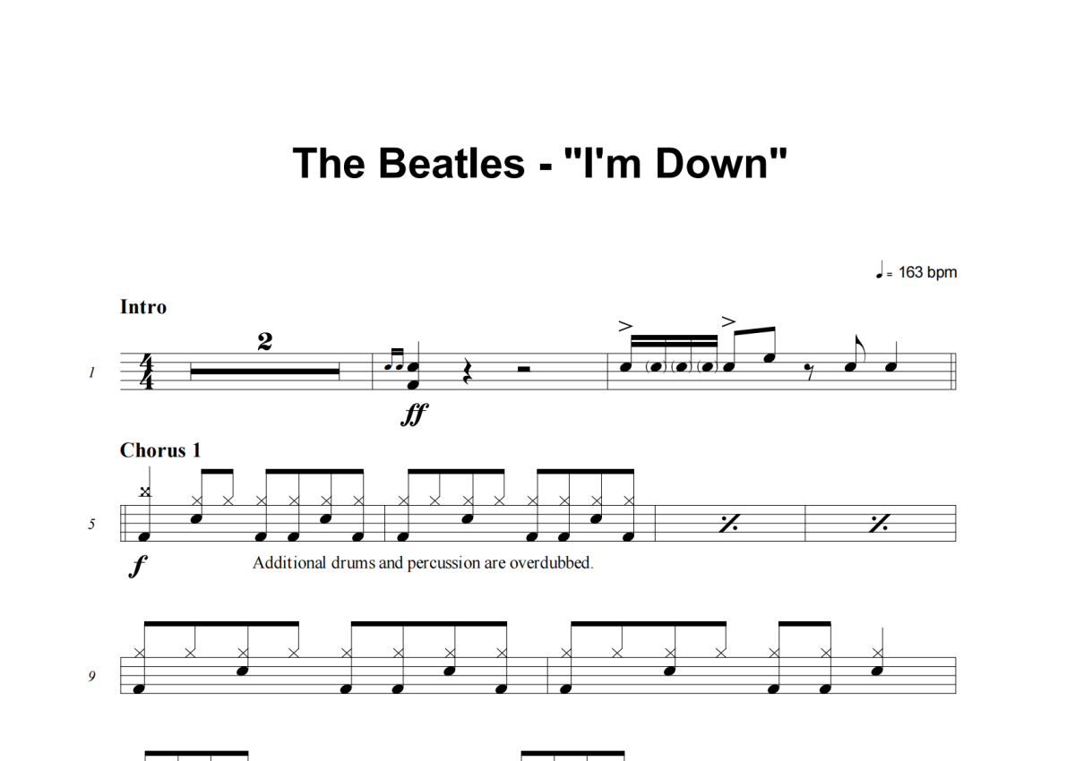 《I'm Down》是The Beatles演唱的一首歌曲,这份架子鼓谱共有四张高清图谱,图谱由 @失眠的土豆 编配上传,图谱使用五线谱编配,使用这份I'm Down架子鼓谱,你将能够轻松地敲打出这首The Beatles的I'm Down,快来尝试吧。