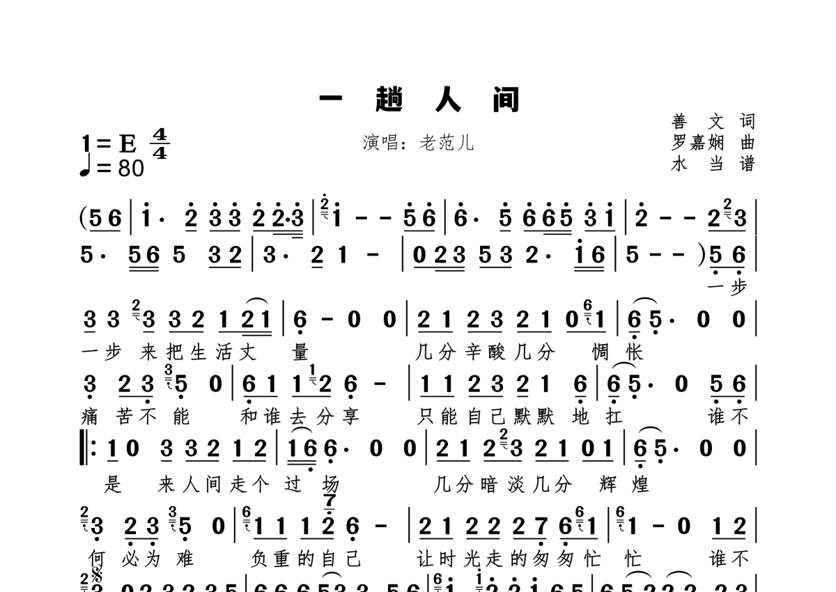 《一趟人间》是老范儿演唱的一首歌曲,拍号为4/4拍,歌曲速度为每分钟80拍,这份简谱共有一张高清图谱,图谱由 @水当 编配上传原调E。