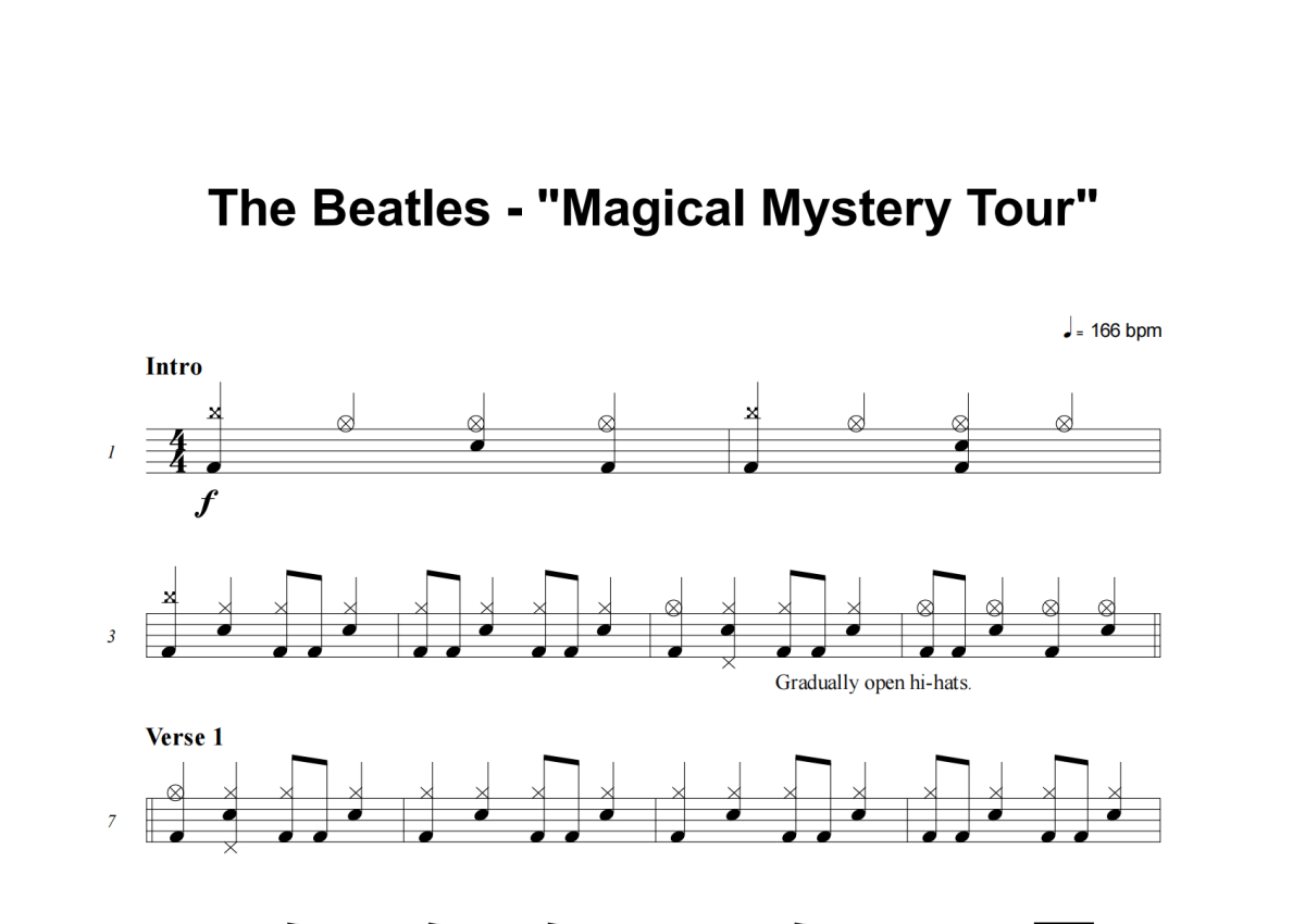 《Magical Mystery Tour》是The Beatles演唱的一首歌曲,这份架子鼓谱共有四张高清图谱,图谱由 @失眠的土豆 编配上传,图谱使用五线谱编配,使用这份Magical Mystery Tour架子鼓谱,你将能够轻松地敲打出这首The Beatles的Magical Mystery Tour,快来尝试吧。