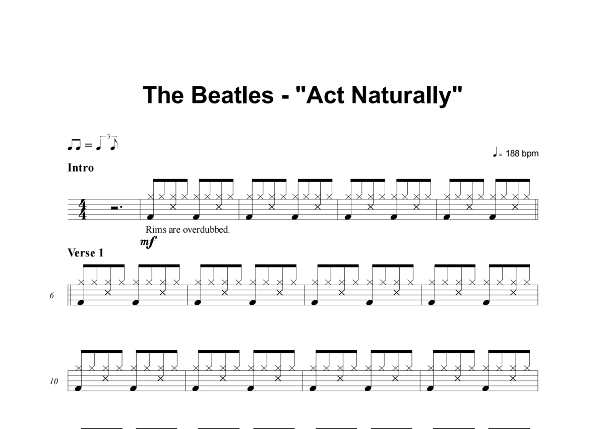 《Act Naturally》是The Beatles演唱的一首歌曲,这份架子鼓谱共有四张高清图谱,图谱由 @庄颜 编配上传,图谱使用五线谱编配,使用这份Act Naturally架子鼓谱,你将能够轻松地敲打出这首The Beatles的Act Naturally,快来尝试吧。