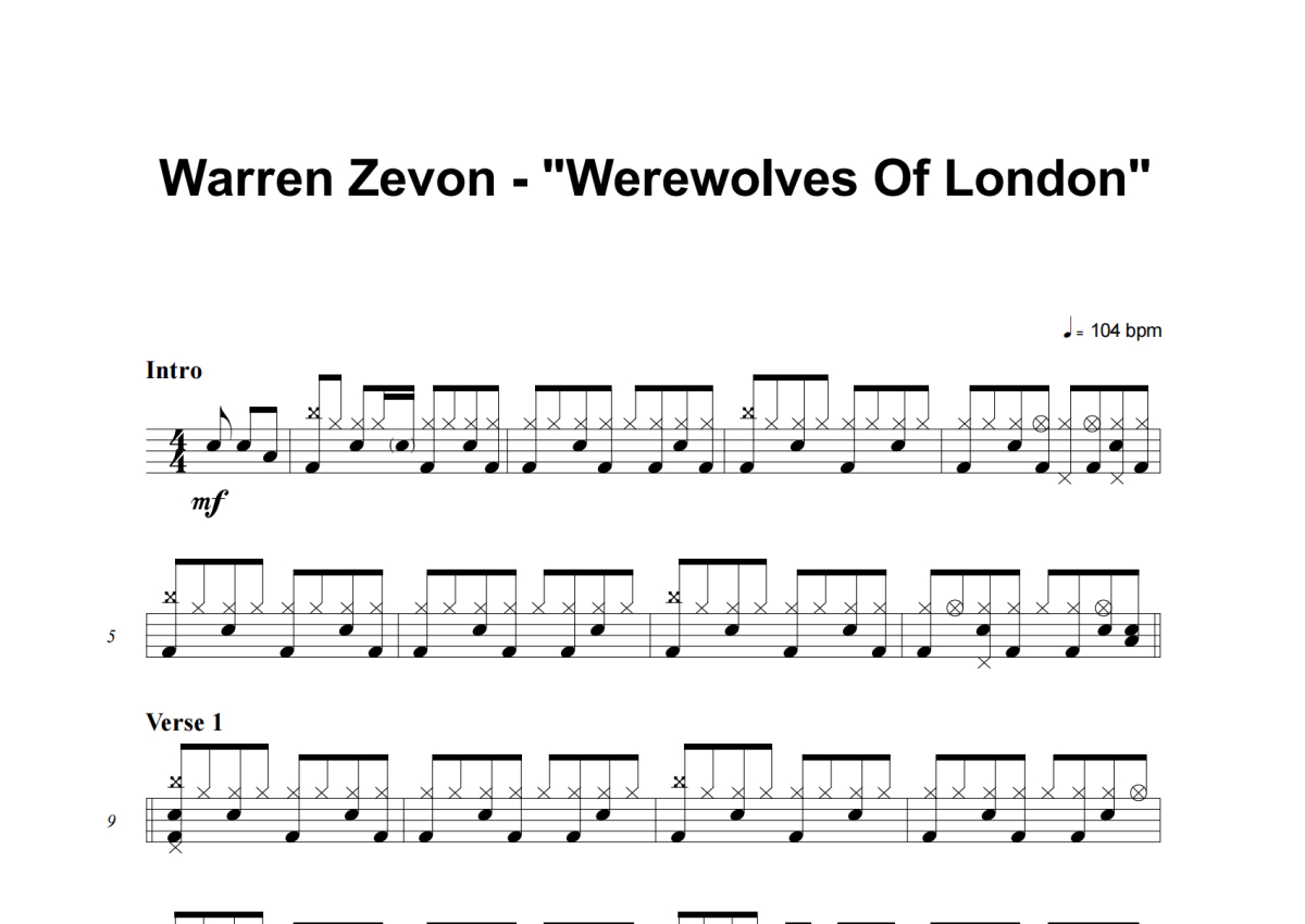 《Werewolves Of London》是Warren Zevon演唱的一首歌曲,这份架子鼓谱共有三张高清图谱,图谱由 @16分音符 编配上传,图谱使用五线谱编配,使用这份Werewolves Of London架子鼓谱,你将能够轻松地敲打出这首Warren Zevon的Werewolves Of London,快来尝试吧。