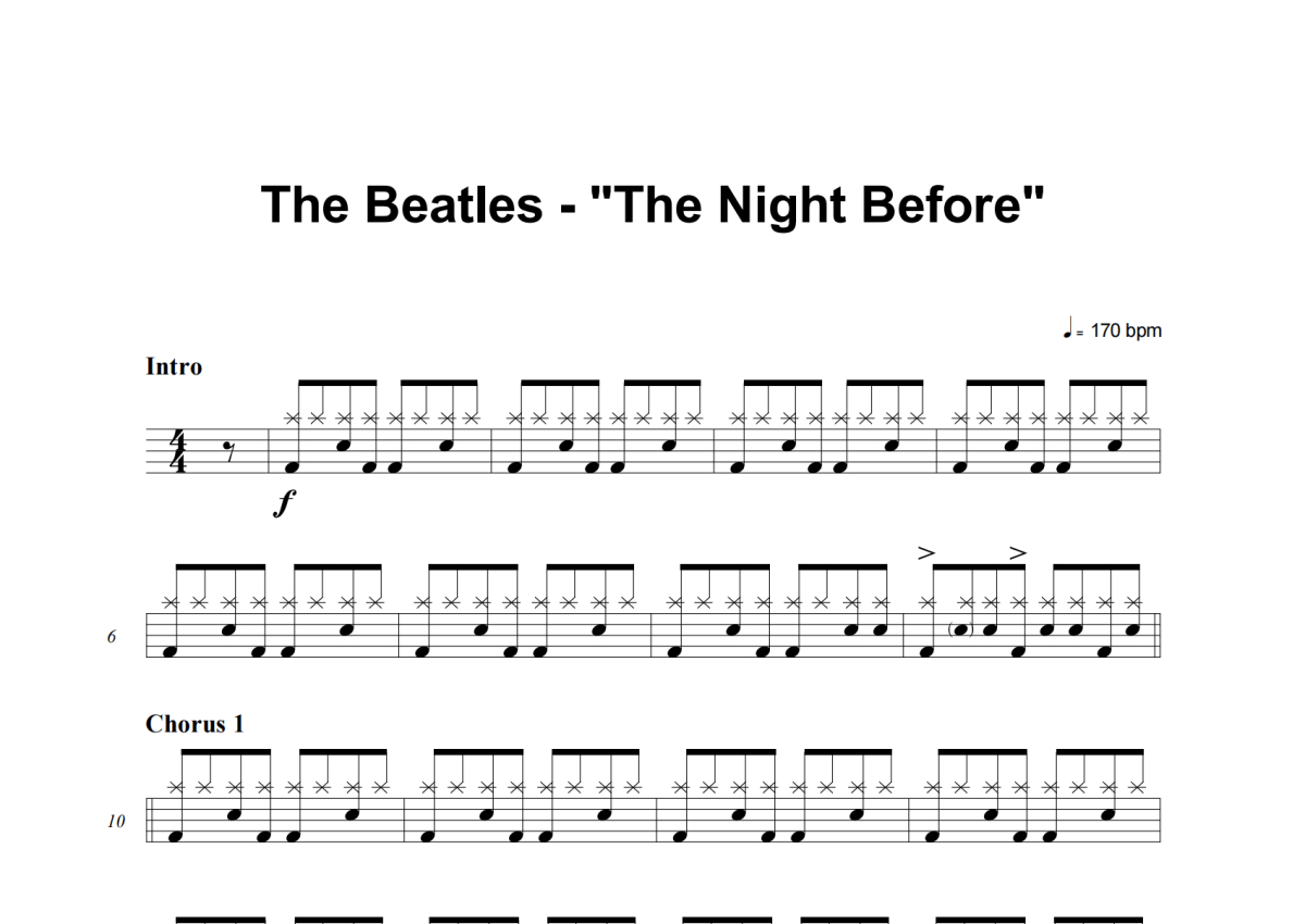 《The Night Before》是The Beatles演唱的一首歌曲,这份架子鼓谱共有四张高清图谱,图谱由 @16分音符 编配上传,图谱使用五线谱编配,使用这份The Night Before架子鼓谱,你将能够轻松地敲打出这首The Beatles的The Night Before,快来尝试吧。