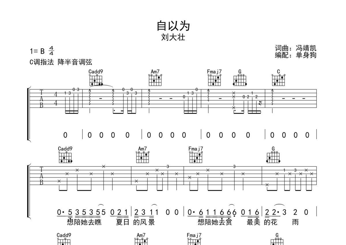 《自以为》是刘大壮演唱的一首歌曲,本吉他谱采用的是C调指法编配,这份吉他谱共有三张高清图谱,图谱由 @单身狗 编配上传,图谱使用六线谱编配,包含吉他和弦指法、简谱以及歌词部分,使用这份自以为吉他谱,可以让你更加方便地掌握这首歌曲的弹唱技巧,快来尝试吧。刘大壮《自以为》吉他弹唱谱,采用C调指法编配,单身狗编配出品,共有3张高清图谱。