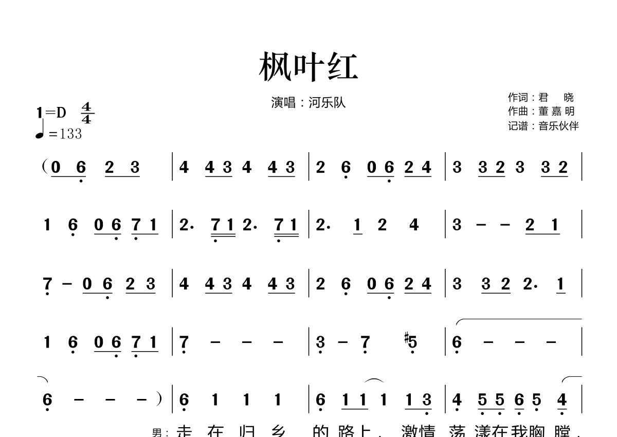 《枫叶红》是河乐队/安娜 (Anais Martane)/郭龙/张玮玮演唱的一首歌曲,这份简谱共有四张高清图谱,图谱由 @音乐伙伴 编配上传。