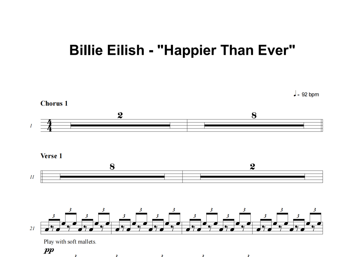 《Happier Than Ever》是Billie Eilish演唱的一首歌曲,这份架子鼓谱共有三张高清图谱,图谱由 @老虎不说谎 编配上传,图谱使用五线谱编配,使用这份Happier Than Ever架子鼓谱,你将能够轻松地敲打出这首Billie Eilish的Happier Than Ever,快来尝试吧。