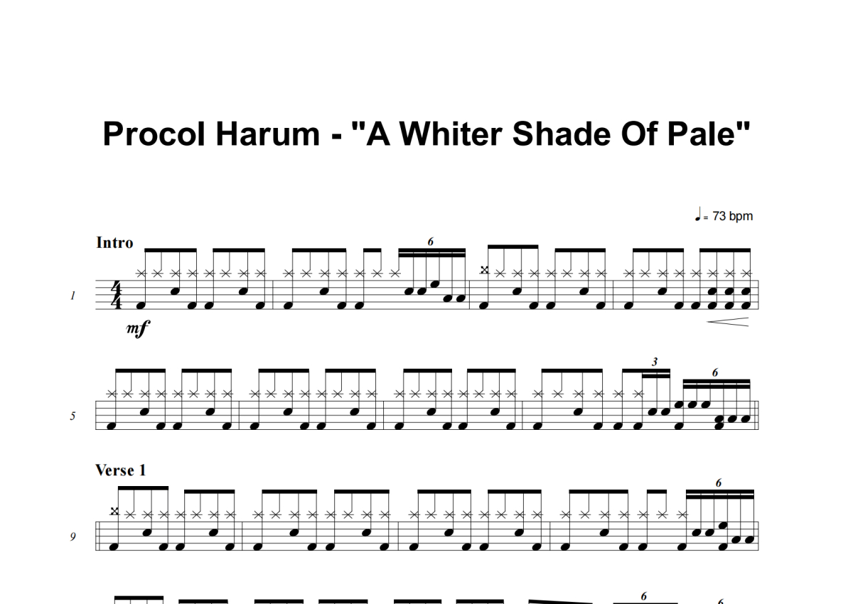 《A Whiter Shade Of Pale》是Procol Harum演唱的一首歌曲,这份架子鼓谱共有三张高清图谱,图谱由 @老虎不说谎 编配上传,图谱使用五线谱编配,使用这份A Whiter Shade Of Pale架子鼓谱,你将能够轻松地敲打出这首Procol Harum的A Whiter Shade Of Pale,快来尝试吧。