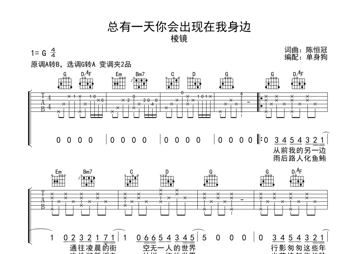 梭镜乐队《总有一天你会出现在我身边》吉他谱 - G调弹唱六线谱