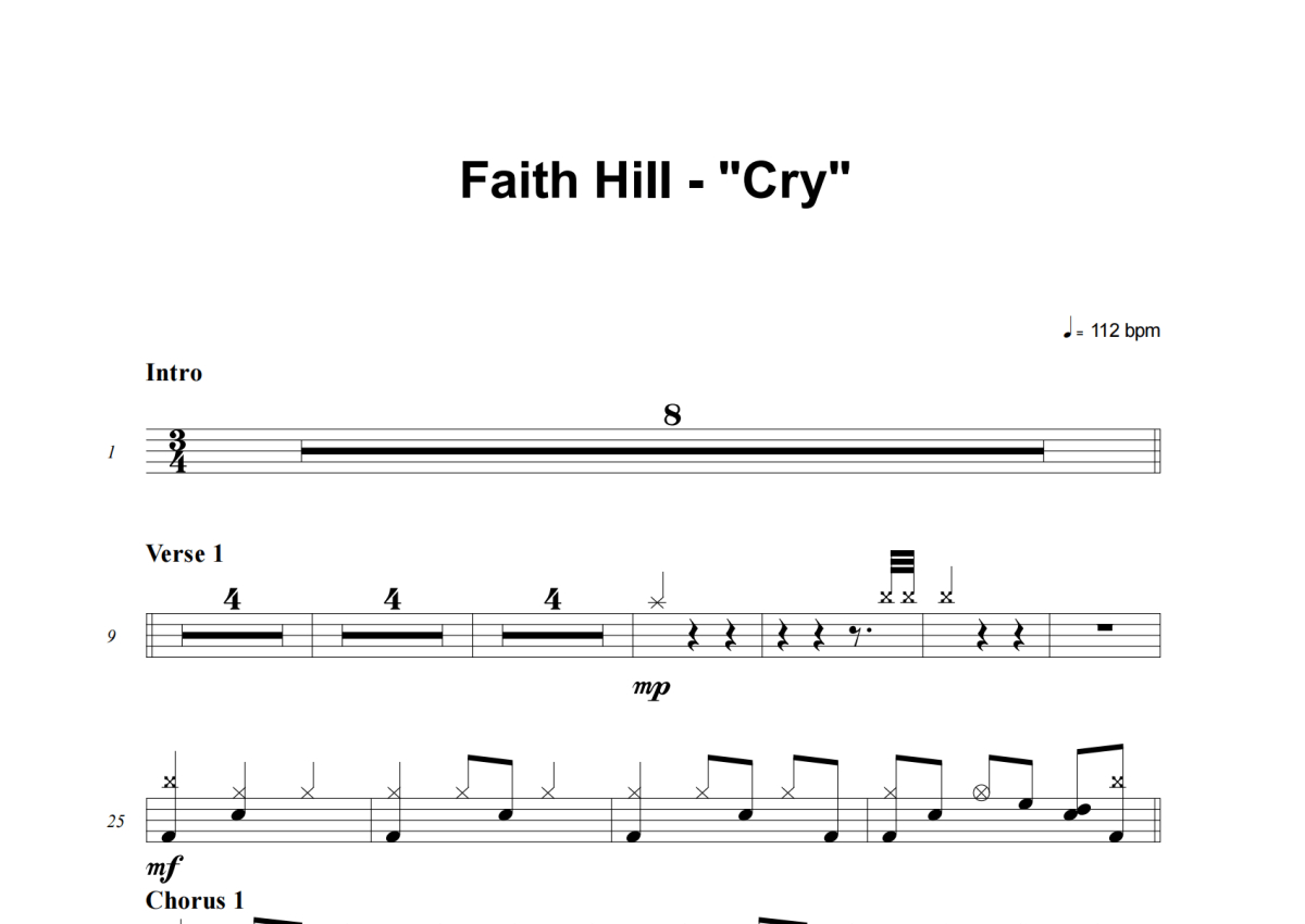 《Cry》是Faith Hill演唱的一首歌曲,这份架子鼓谱共有四张高清图谱,图谱由 @老虎不说谎 编配上传,图谱使用五线谱编配,使用这份Cry架子鼓谱,你将能够轻松地敲打出这首Faith Hill的Cry,快来尝试吧。