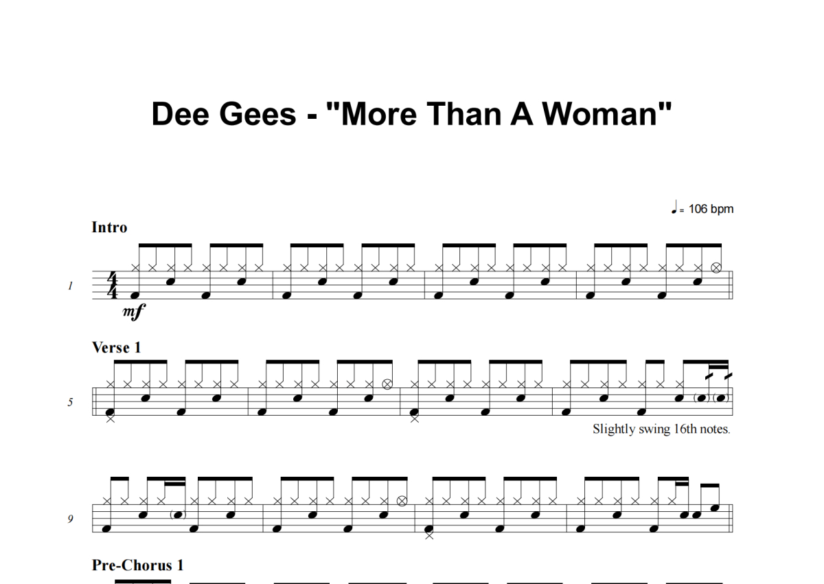 《More Than A Woman》是Foo Fighters演唱的一首歌曲,这份架子鼓谱共有三张高清图谱,图谱由 @老虎不说谎 编配上传,图谱使用五线谱编配,使用这份More Than A Woman架子鼓谱,你将能够轻松地敲打出这首Foo Fighters的More Than A Woman,快来尝试吧。