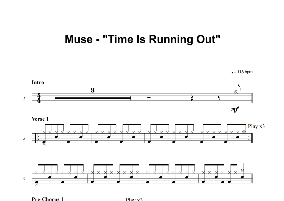 《Time Is Running Out》是Muse演唱的一首歌曲,这份架子鼓谱共有三张高清图谱,图谱由 @老虎不说谎 编配上传,图谱使用五线谱编配,使用这份Time Is Running Out架子鼓谱,你将能够轻松地敲打出这首Muse的Time Is Running Out,快来尝试吧。