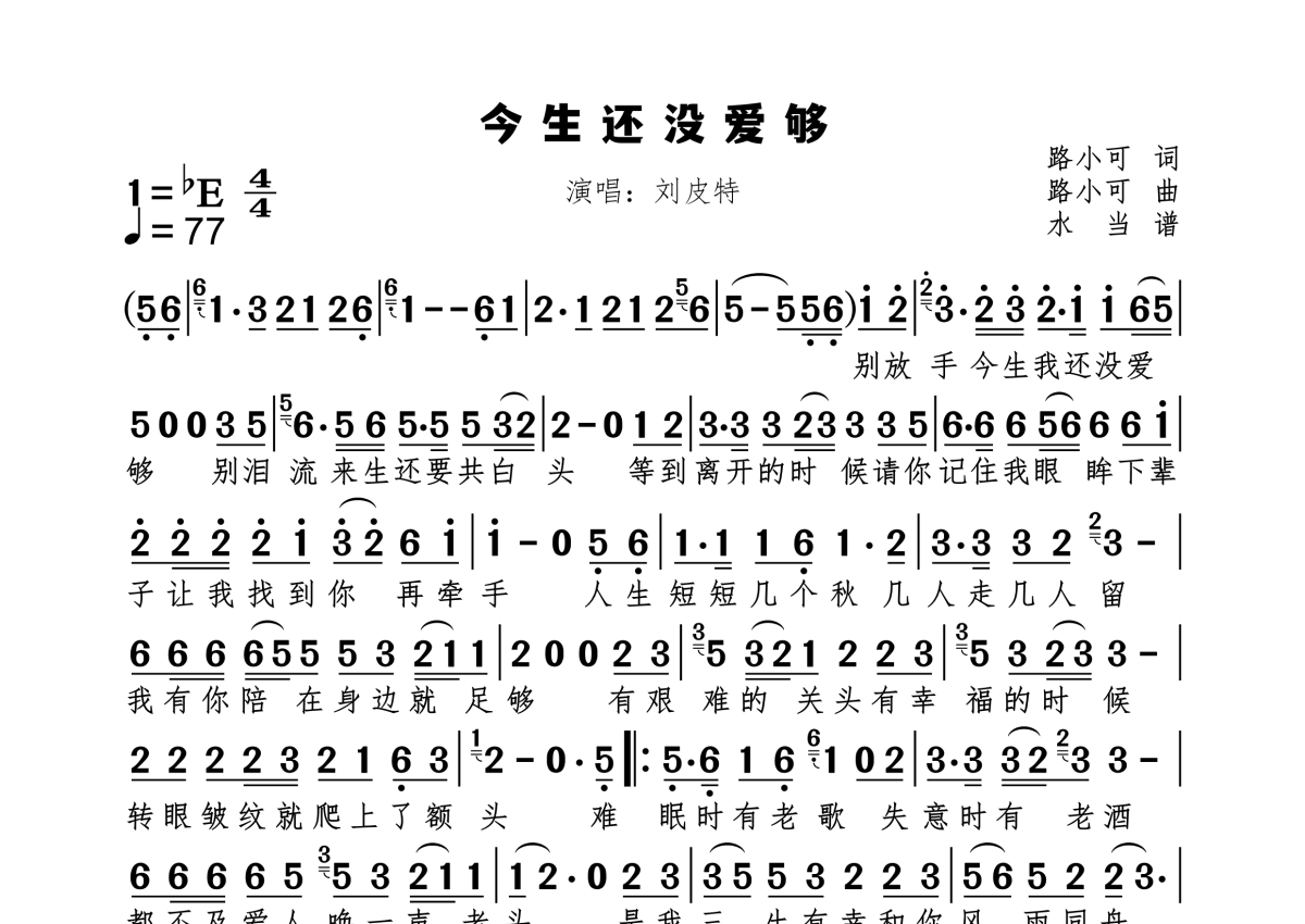 《今生还没爱够》是刘皮特演唱的一首歌曲,拍号为4/4拍,歌曲速度为每分钟77拍,这份简谱共有一张高清图谱,图谱由 @水当 编配上传原调bE。