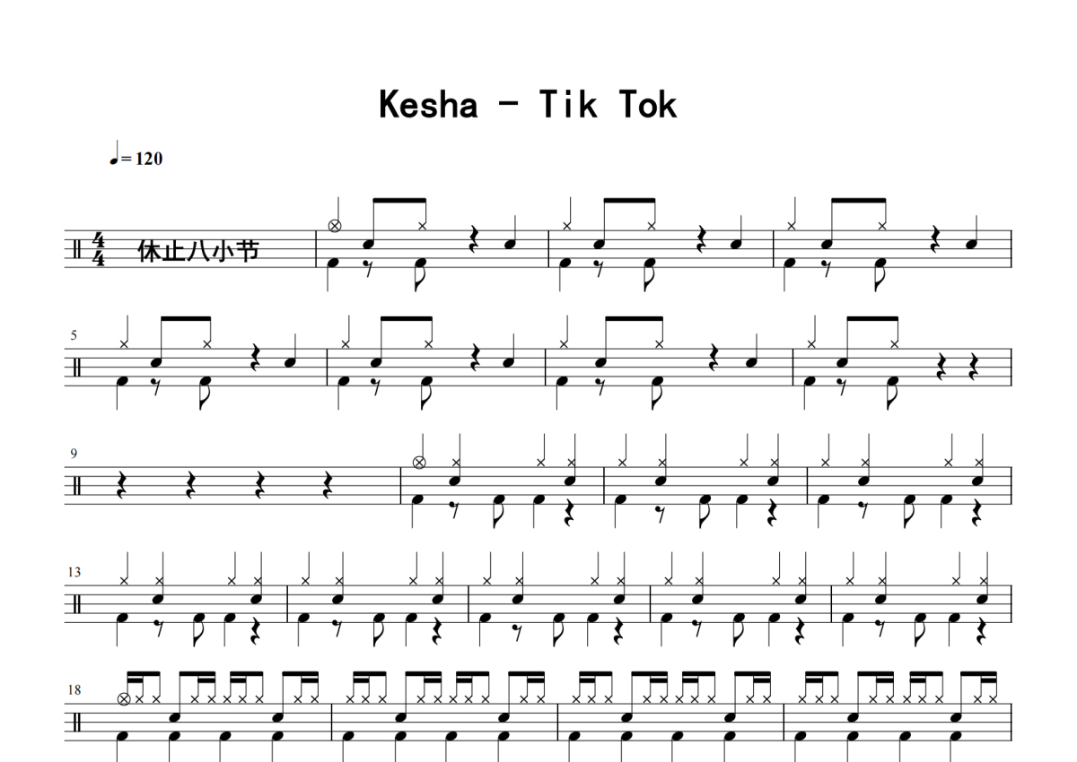 《TIK TOK》是Kesha演唱的一首歌曲,这份架子鼓谱共有两张高清图谱,图谱由 @失眠的土豆 编配上传,图谱使用五线谱编配,使用这份TIK TOK架子鼓谱,你将能够轻松地敲打出这首Kesha的TIK TOK,快来尝试吧。