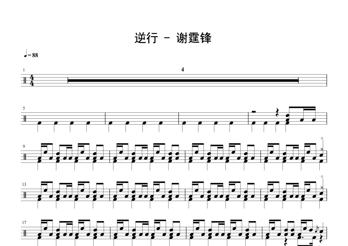 《逆行》是谢霆锋演唱的一首歌曲,这份架子鼓谱共有三张高清图谱,图谱由 @失眠的土豆 编配上传,图谱使用五线谱编配,使用这份逆行架子鼓谱,你将能够轻松地敲打出这首谢霆锋的逆行,快来尝试吧。