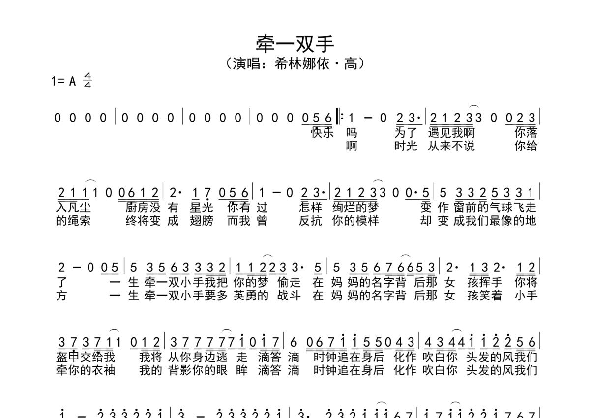 《牵一双手》是希林娜依高演唱的一首歌曲,拍号为4/4拍,这份简谱共有一张高清图谱,图谱由 @SRV7758521 编配上传。