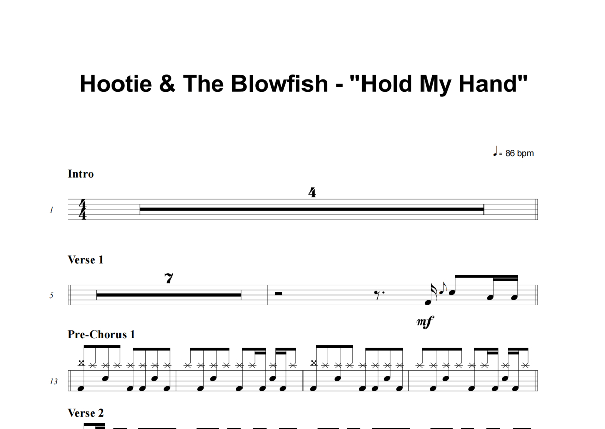 《Hold My Hand》是Hootie & The Blowfish演唱的一首歌曲,这份架子鼓谱共有三张高清图谱,图谱由 @失眠的土豆 编配上传,图谱使用五线谱编配,使用这份Hold My Hand架子鼓谱,你将能够轻松地敲打出这首Hootie & The Blowfish的Hold My Hand,快来尝试吧。