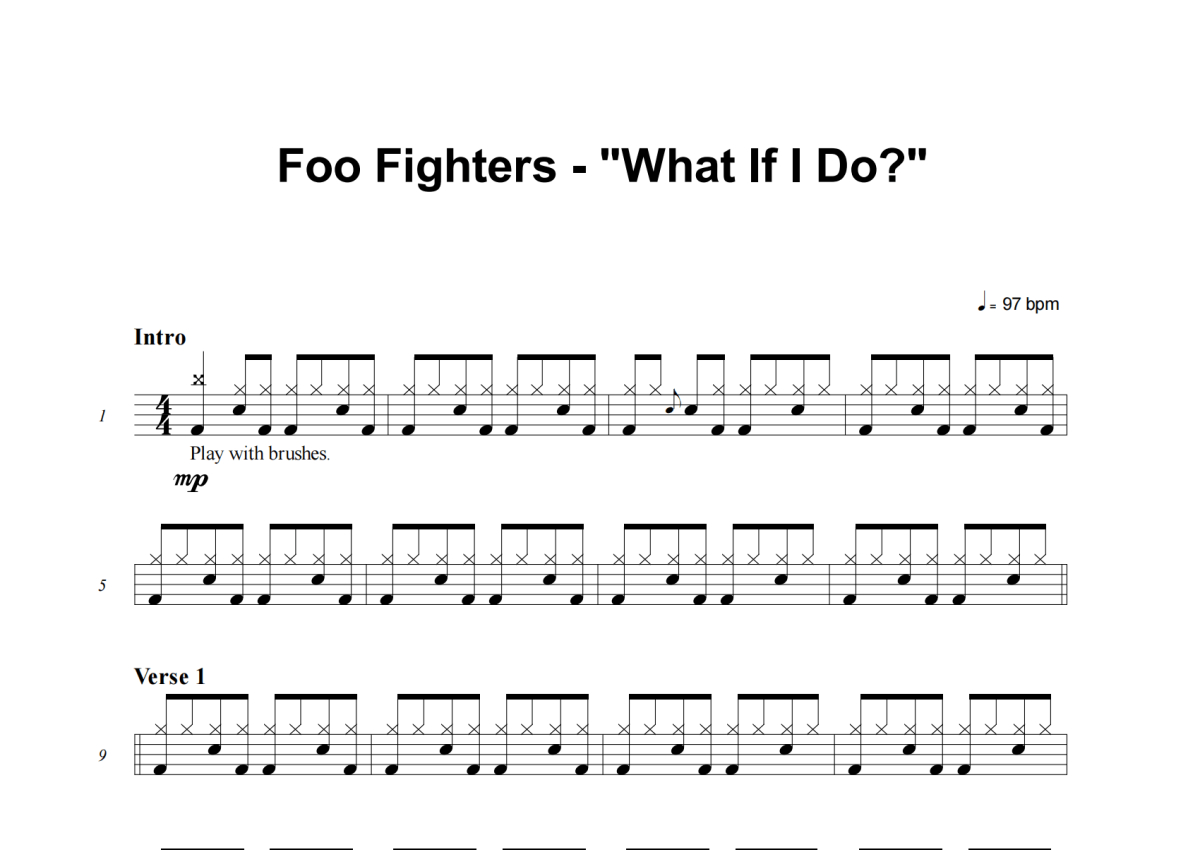 《What If I Do》是Foo Fighters演唱的一首歌曲,这份架子鼓谱共有四张高清图谱,图谱由 @失眠的土豆 编配上传,图谱使用五线谱编配,使用这份What If I Do架子鼓谱,你将能够轻松地敲打出这首Foo Fighters的What If I Do,快来尝试吧。