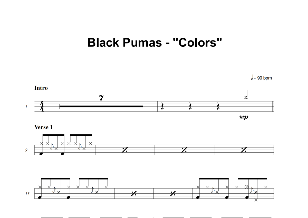 《Colors》是Black Pumas演唱的一首歌曲,这份架子鼓谱共有三张高清图谱,图谱由 @失眠的土豆 编配上传,图谱使用五线谱编配,使用这份Colors架子鼓谱,你将能够轻松地敲打出这首Black Pumas的Colors,快来尝试吧。