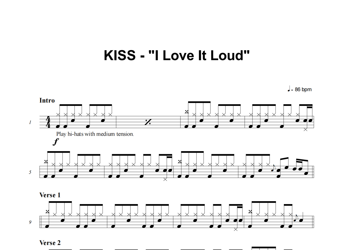 《I Love It Loud》是KISS演唱的一首歌曲,这份架子鼓谱共有四张高清图谱,图谱由 @失眠的土豆 编配上传,图谱使用五线谱编配,使用这份I Love It Loud架子鼓谱,你将能够轻松地敲打出这首KISS的I Love It Loud,快来尝试吧。