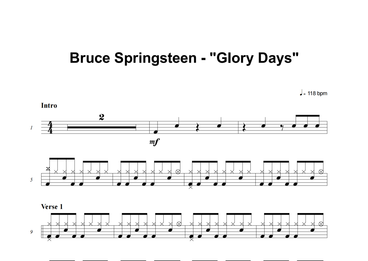 《Glory Days》是Bruce Springsteen演唱的一首歌曲,这份架子鼓谱共有四张高清图谱,图谱由 @失眠的土豆 编配上传,图谱使用五线谱编配,使用这份Glory Days架子鼓谱,你将能够轻松地敲打出这首Bruce Springsteen的Glory Days,快来尝试吧。