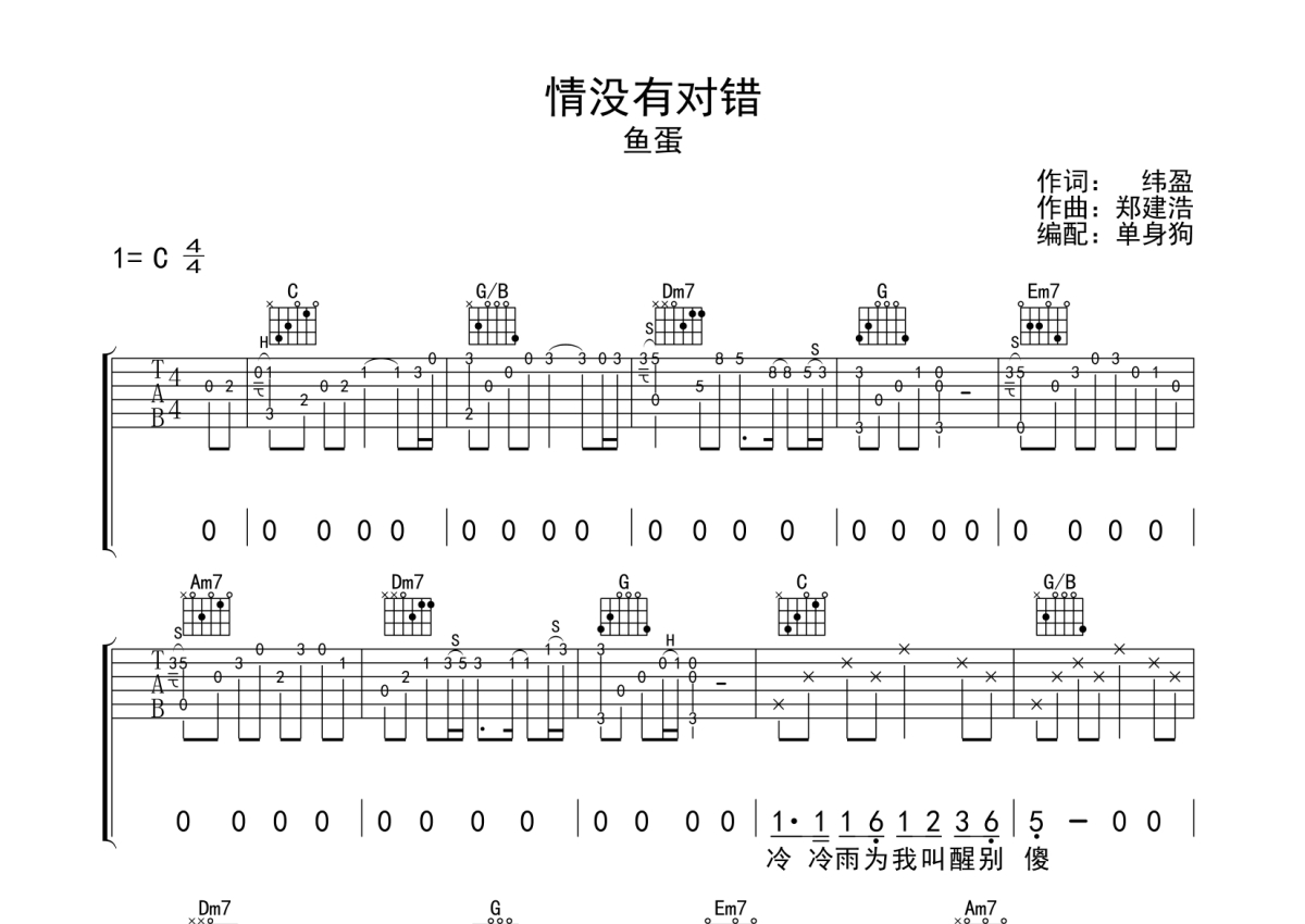 情没有对错吉他谱 - 鱼蛋演唱 - C调弹唱六线谱