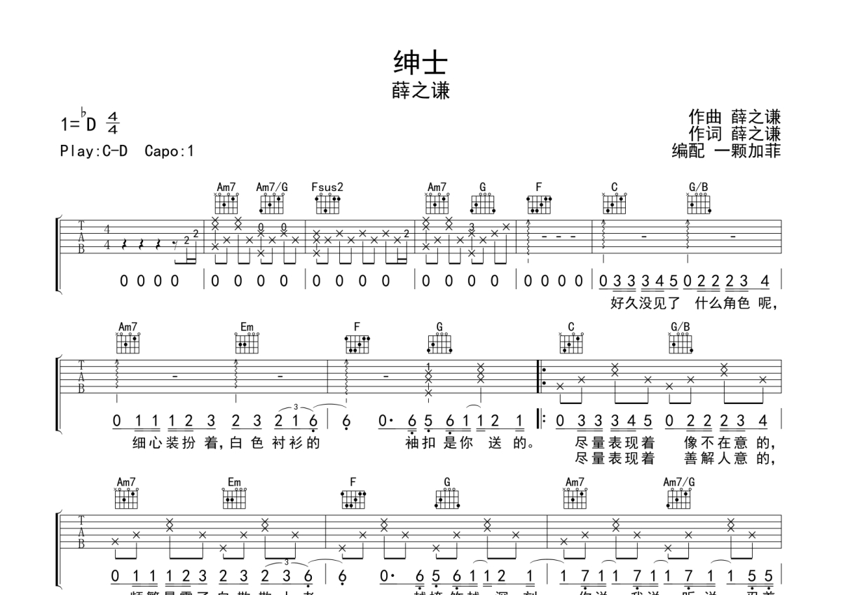 绅士吉他谱 - 薛之谦演唱 - C调弹唱六线谱
