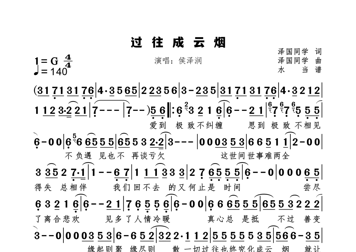 《过往成云烟》是侯泽润演唱的一首歌曲,拍号为4/4拍,歌曲速度为每分钟140拍,这份简谱共有一张高清图谱,图谱由 @水当 编配上传原调G。