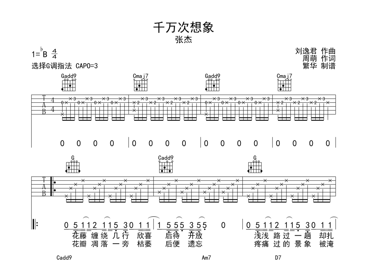 《千万次想象》是张杰演唱的一首歌曲,歌曲速度为每分钟90拍,歌曲原调为Bb调,但由于原调指法比较难,为了方便弹奏,本吉他谱采用的是G调指法编配,变调夹3品弹奏即为原调,当然也可以根据自己的音域改变变调夹位置,或者通过改变和弦调性,以方便自己弹奏,这份吉他谱共有三张高清图谱,图谱由 @繁华 编配上传,图谱使用六线谱编配,包含吉他和弦指法、简谱以及歌词部分,使用这份千万次想象吉他谱,可以让你更加方便地掌握这首歌曲的弹唱技巧,快来尝试吧。本谱采用G调指法编配,变调夹夹3品。