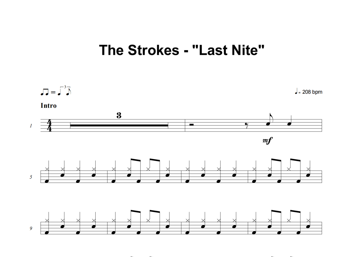《Last Nite》是The Strokes演唱的一首歌曲,这份架子鼓谱共有六张高清图谱,图谱由 @失眠的土豆 编配上传,图谱使用五线谱编配,使用这份Last Nite架子鼓谱,你将能够轻松地敲打出这首The Strokes的Last Nite,快来尝试吧。