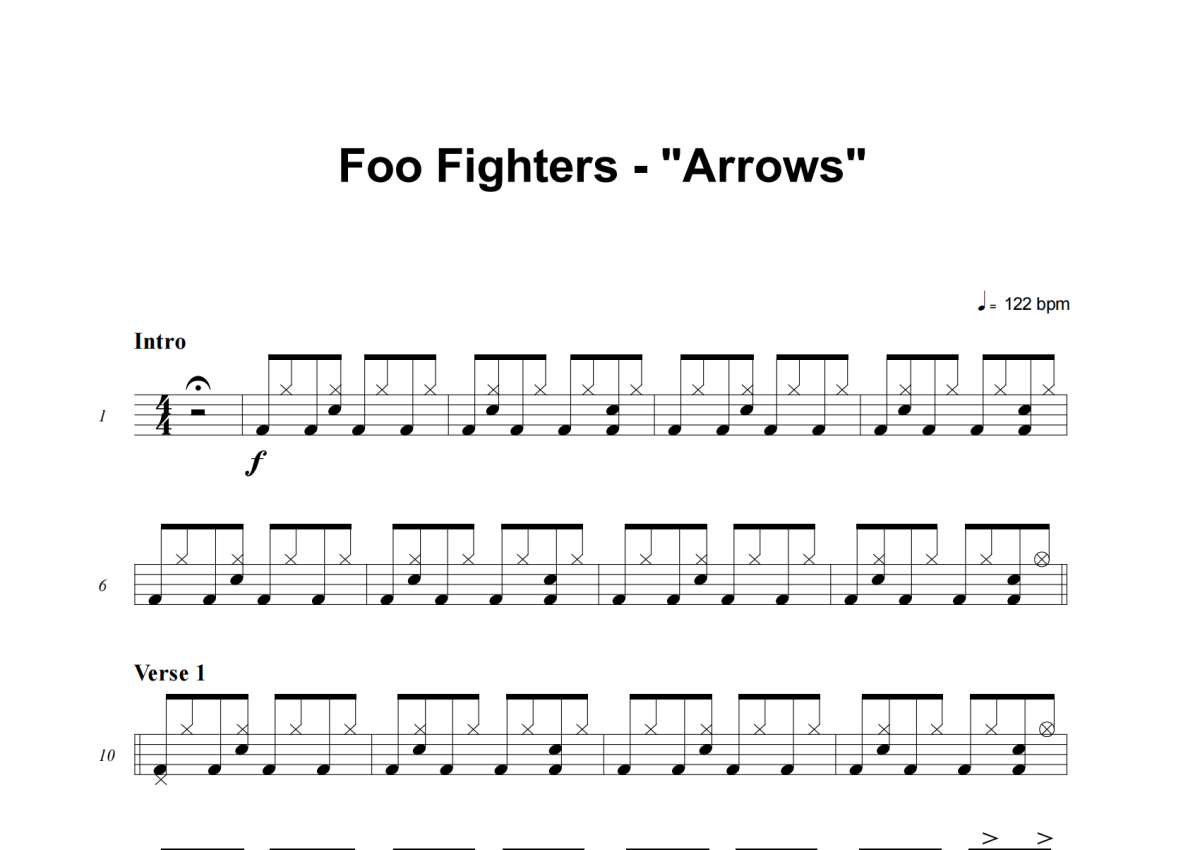 《Arrows》是Foo Fighters演唱的一首歌曲,这份架子鼓谱共有四张高清图谱,图谱由 @失眠的土豆 编配上传,图谱使用五线谱编配,使用这份Arrows架子鼓谱,你将能够轻松地敲打出这首Foo Fighters的Arrows,快来尝试吧。