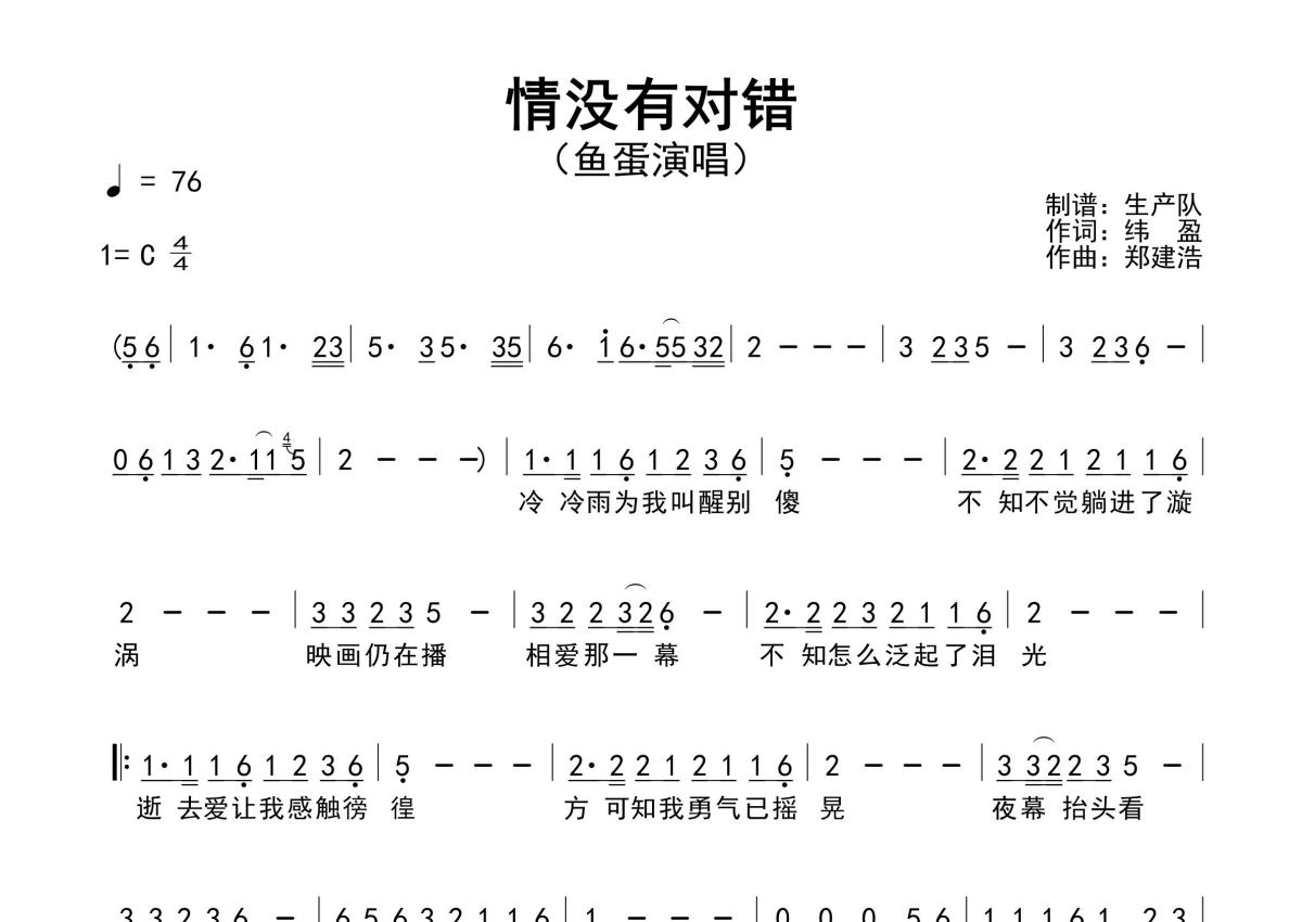 《情没有对错》是鱼蛋演唱的一首歌曲,原版简谱,拍号为4/4拍,歌曲速度为每分钟76拍,这份简谱共有一张高清图谱,图谱由 @生产队 编配上传鱼蛋演唱的粤语歌曲《情没有对错》原版简谱,含前奏、间奏solo编配,值得推荐。