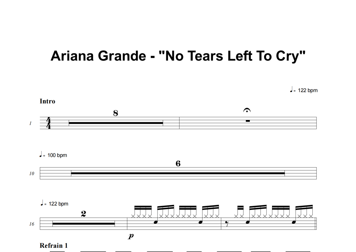《No Tears Left To Cry》是Ariana Grande演唱的一首歌曲,这份架子鼓谱共有六张高清图谱,图谱由 @失眠的土豆 编配上传,图谱使用五线谱编配,使用这份No Tears Left To Cry架子鼓谱,你将能够轻松地敲打出这首Ariana Grande的No Tears Left To Cry,快来尝试吧。
