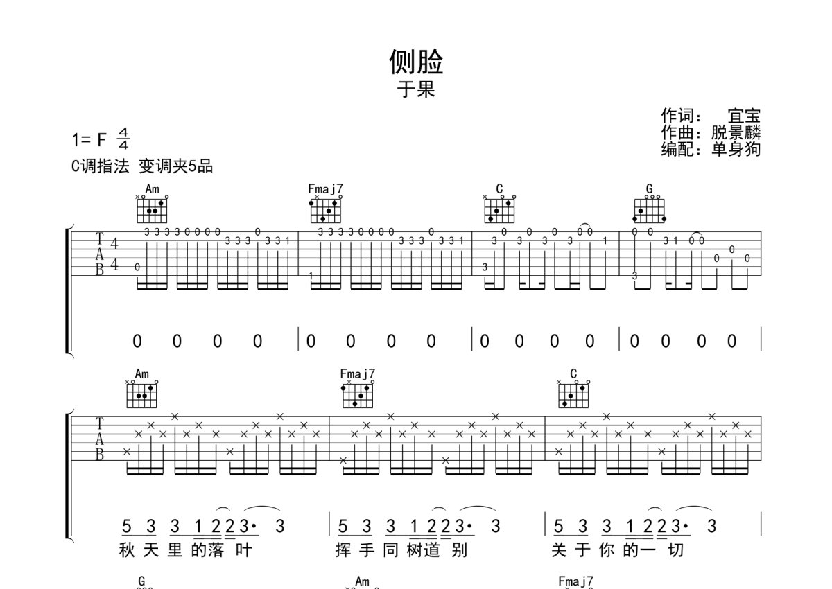 于果《侧脸》吉他谱 - C调弹唱六线谱