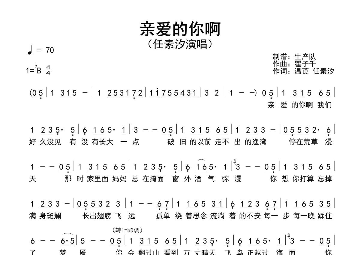 《亲爱的你啊》是任素汐演唱的一首歌曲,原版简谱,拍号为4/4拍,歌曲速度为每分钟70拍,这份简谱共有一张高清图谱,图谱由 @生产队 编配上传任素汐演唱的歌曲《亲爱的你啊》原版简谱,含前奏、间奏solo和转调编配,值得推荐。