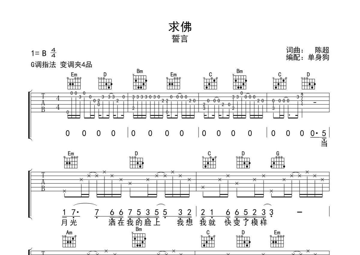 《求佛》是誓言演唱的一首歌曲,本吉他谱采用的是G调指法编配,这份吉他谱共有三张高清图谱,图谱由 @单身狗 编配上传,图谱使用六线谱编配,包含吉他和弦指法、简谱以及歌词部分,使用这份求佛吉他谱,可以让你更加方便地掌握这首歌曲的弹唱技巧,快来尝试吧。誓言《求佛》吉他弹唱谱,采用G调指法编配,单身狗编配出品,共有3张高清图谱。