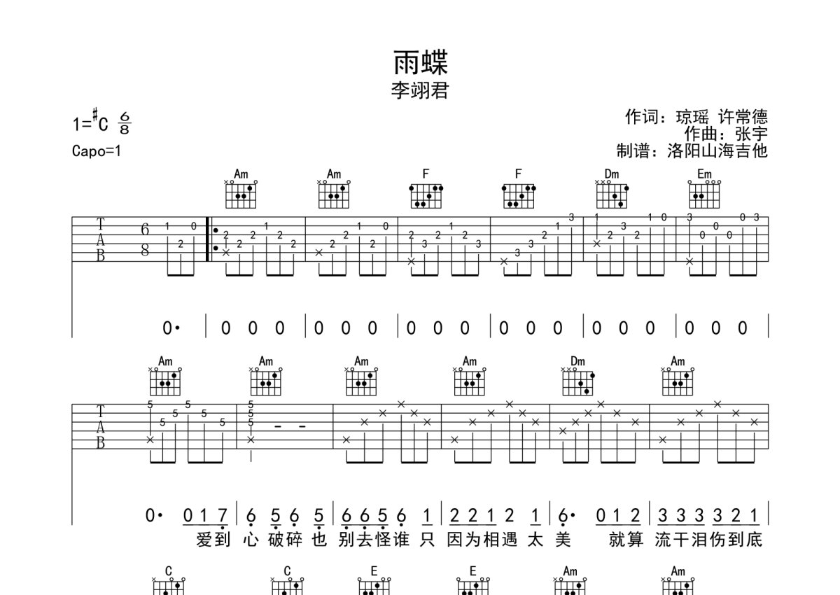 李翊君《雨蝶》吉他谱 - C调弹唱六线谱