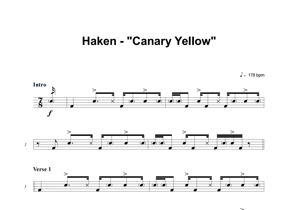 《Canary Yellow》是Haken演唱的一首歌曲,这份架子鼓谱共有五张高清图谱,图谱由 @失眠的土豆 编配上传,图谱使用五线谱编配,使用这份Canary Yellow架子鼓谱,你将能够轻松地敲打出这首Haken的Canary Yellow,快来尝试吧。