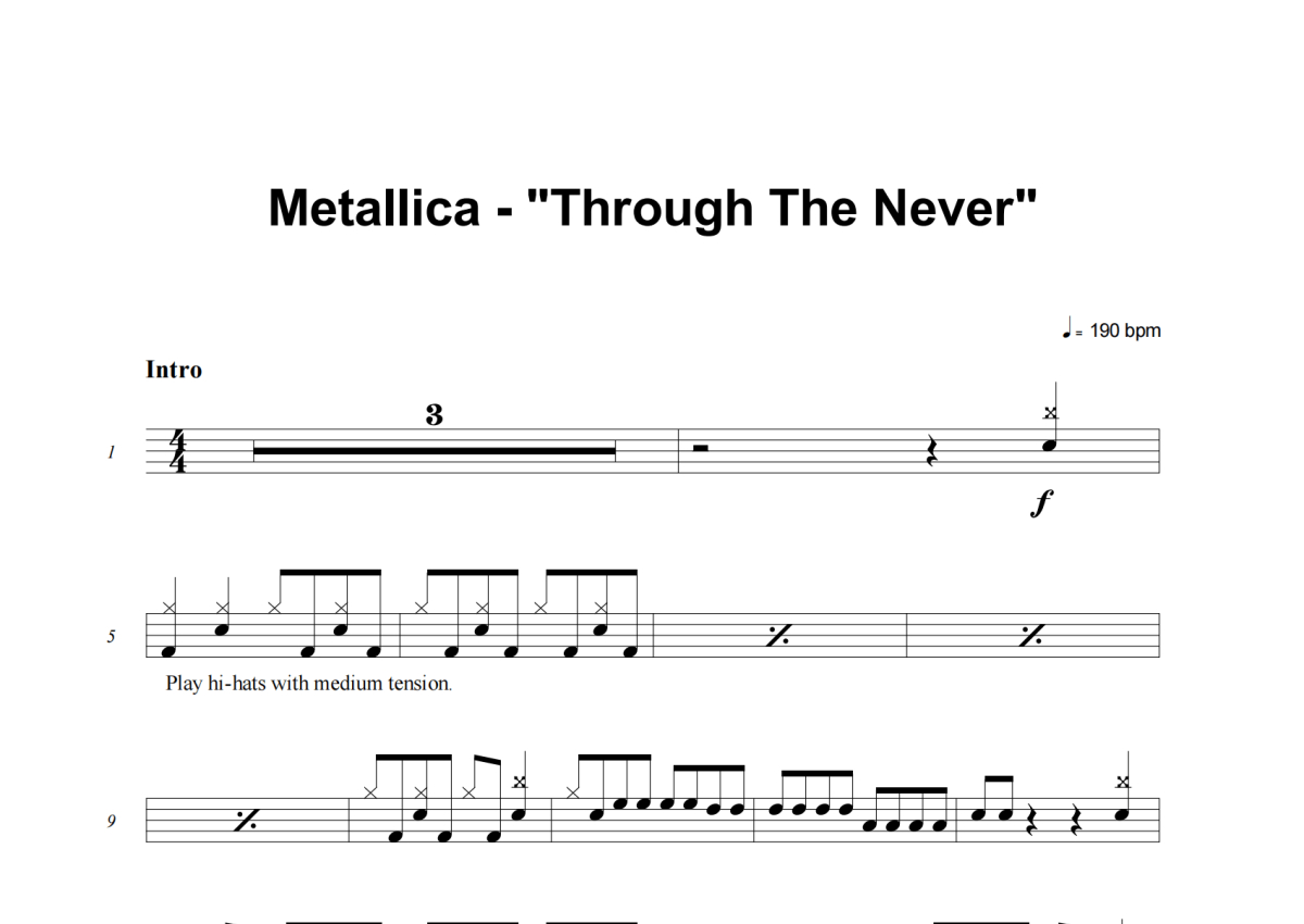 《Through The Never》是Metallica演唱的一首歌曲,这份架子鼓谱共有六张高清图谱,图谱由 @失眠的土豆 编配上传,图谱使用五线谱编配,使用这份Through The Never架子鼓谱,你将能够轻松地敲打出这首Metallica的Through The Never,快来尝试吧。