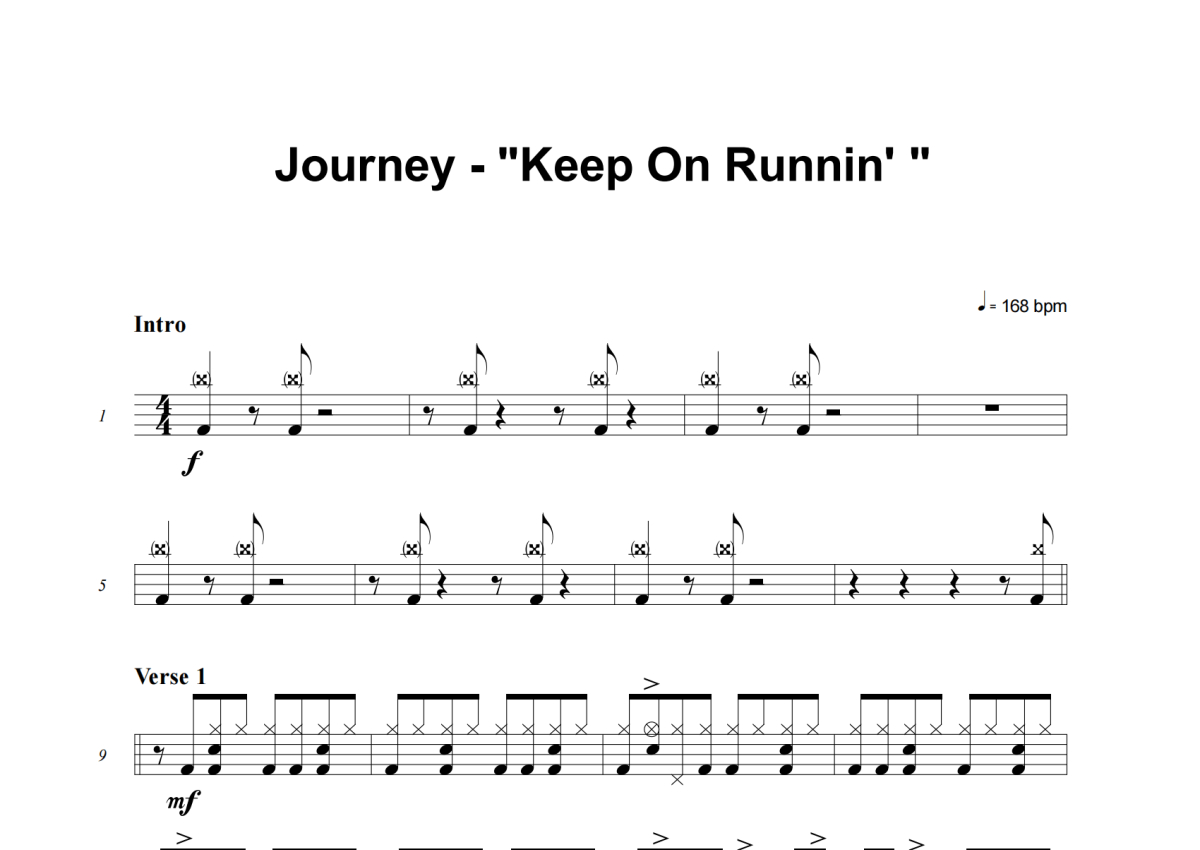 《Keep On Runnin'》是Journey演唱的一首歌曲,这份架子鼓谱共有五张高清图谱,图谱由 @失眠的土豆 编配上传,图谱使用五线谱编配,使用这份Keep On Runnin'架子鼓谱,你将能够轻松地敲打出这首Journey的Keep On Runnin',快来尝试吧。