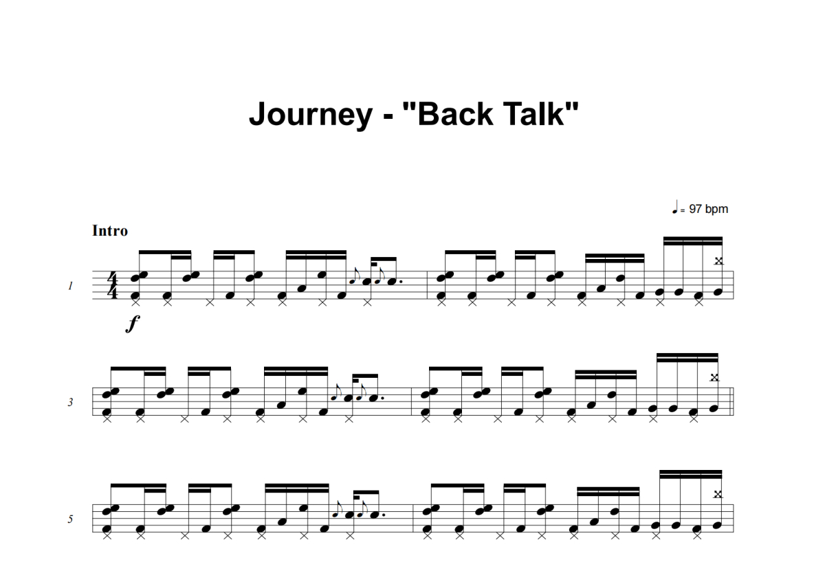 《Back Talk》是Journey演唱的一首歌曲,这份架子鼓谱共有五张高清图谱,图谱由 @失眠的土豆 编配上传,图谱使用五线谱编配,使用这份Back Talk架子鼓谱,你将能够轻松地敲打出这首Journey的Back Talk,快来尝试吧。