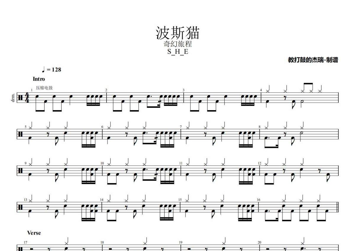 《波斯猫》是SHE演唱的一首歌曲,拍号为4/4拍,歌曲速度为每分钟128拍,这份架子鼓谱共有四张高清图谱,图谱由 @Jerry 编配上传,图谱使用五线谱编配,使用这份波斯猫架子鼓谱,你将能够轻松地敲打出这首SHE的波斯猫,快来尝试吧。