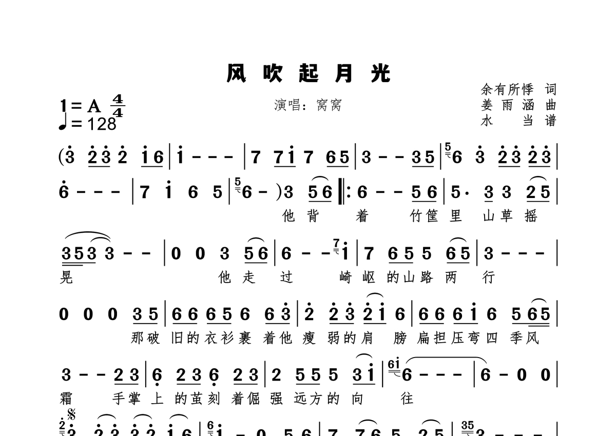 《风吹起月光》是窝窝演唱的一首歌曲,拍号为4/4拍,歌曲速度为每分钟128拍,这份简谱共有一张高清图谱,图谱由 @水当 编配上传原调A。