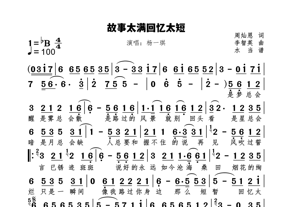 《故事太满回忆太短》是杨一琪演唱的一首歌曲,拍号为4/4拍,歌曲速度为每分钟100拍,这份简谱共有一张高清图谱,图谱由 @水当 编配上传原调bB。