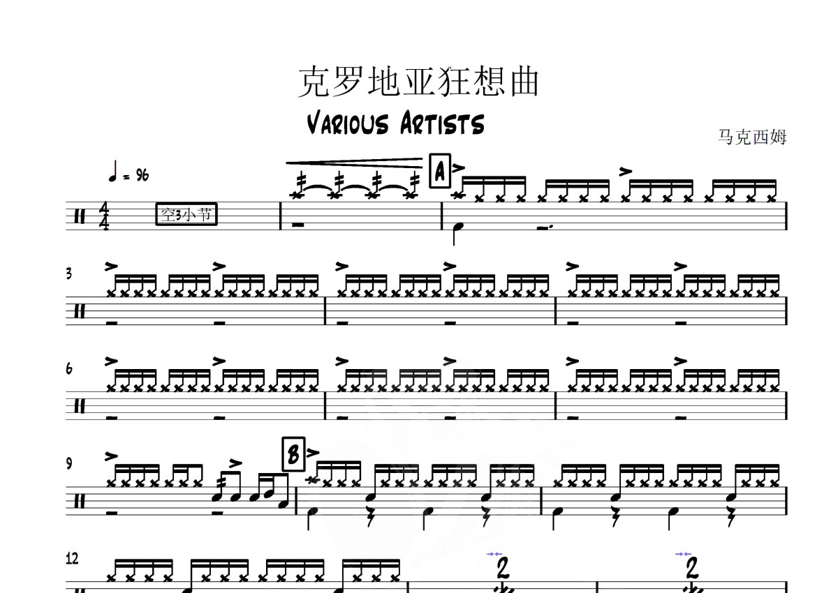 《克罗地亚狂想曲》是马克西姆演唱的一首歌曲,拍号为4/4拍,歌曲速度为每分钟96拍,这份架子鼓谱共有三张高清图谱,图谱由 @音符喷血者 编配上传,图谱使用五线谱编配,使用这份克罗地亚狂想曲架子鼓谱,你将能够轻松地敲打出这首马克西姆的克罗地亚狂想曲,快来尝试吧。