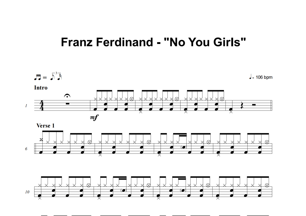 《No You Girls》是Franz Ferdinand演唱的一首歌曲,这份架子鼓谱共有四张高清图谱,图谱由 @失眠的土豆 编配上传,图谱使用五线谱编配,使用这份No You Girls架子鼓谱,你将能够轻松地敲打出这首Franz Ferdinand的No You Girls,快来尝试吧。