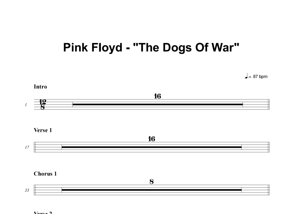 《The Dogs Of War》是Pink Floyd演唱的一首歌曲,这份架子鼓谱共有五张高清图谱,图谱由 @失眠的土豆 编配上传,图谱使用五线谱编配,使用这份The Dogs Of War架子鼓谱,你将能够轻松地敲打出这首Pink Floyd的The Dogs Of War,快来尝试吧。